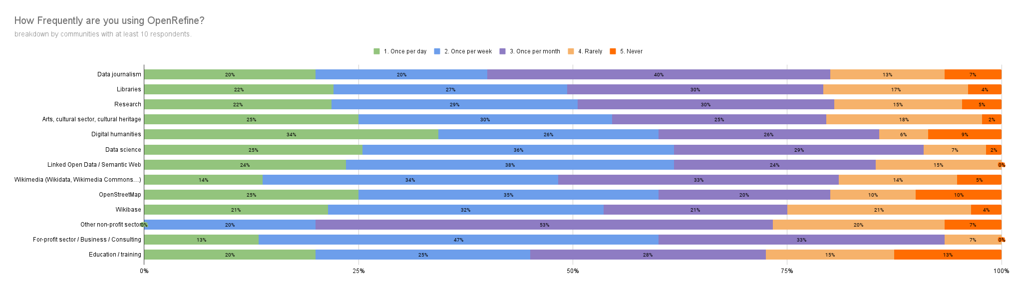 We conducted a more in-depth analysis by correlating the frequency of OpenRefine usage with the communities identified by users (only communities with at least 10 respondents were included in this analysis). Our findings indicate that Humanities, Data Science, and the Semantic Web have the highest regular usage, with over 60% of respondents using OpenRefine at least once a week.